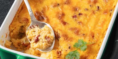 This cheesy casserole makes a great brunch dish. Pair it with a bowl of fresh fruit and a side of thickly-sliced Texas toast. “Grits” is simply another name for ground corn and can be bought in several grinds from coars to fine.